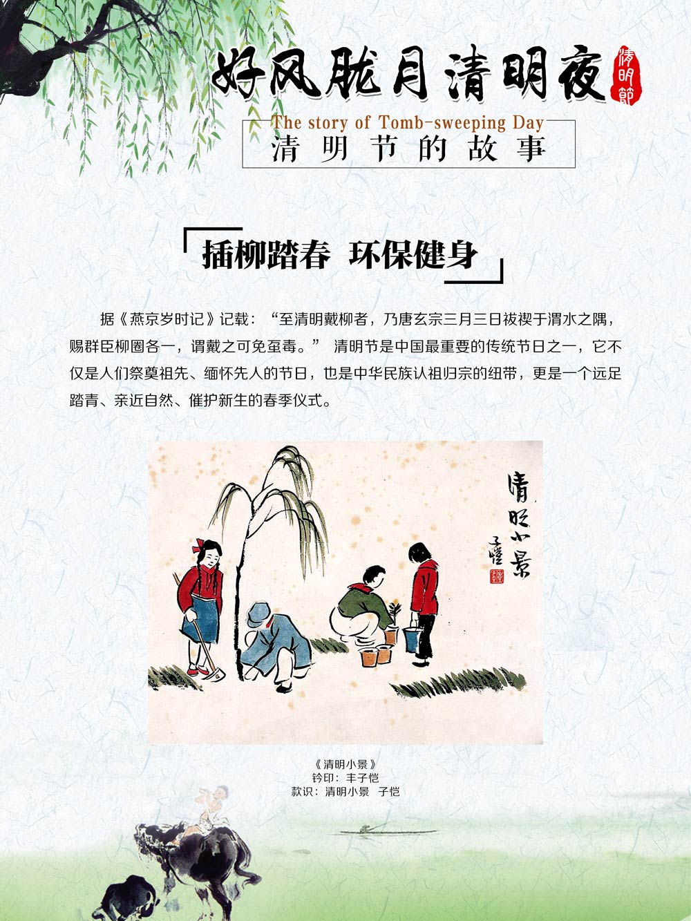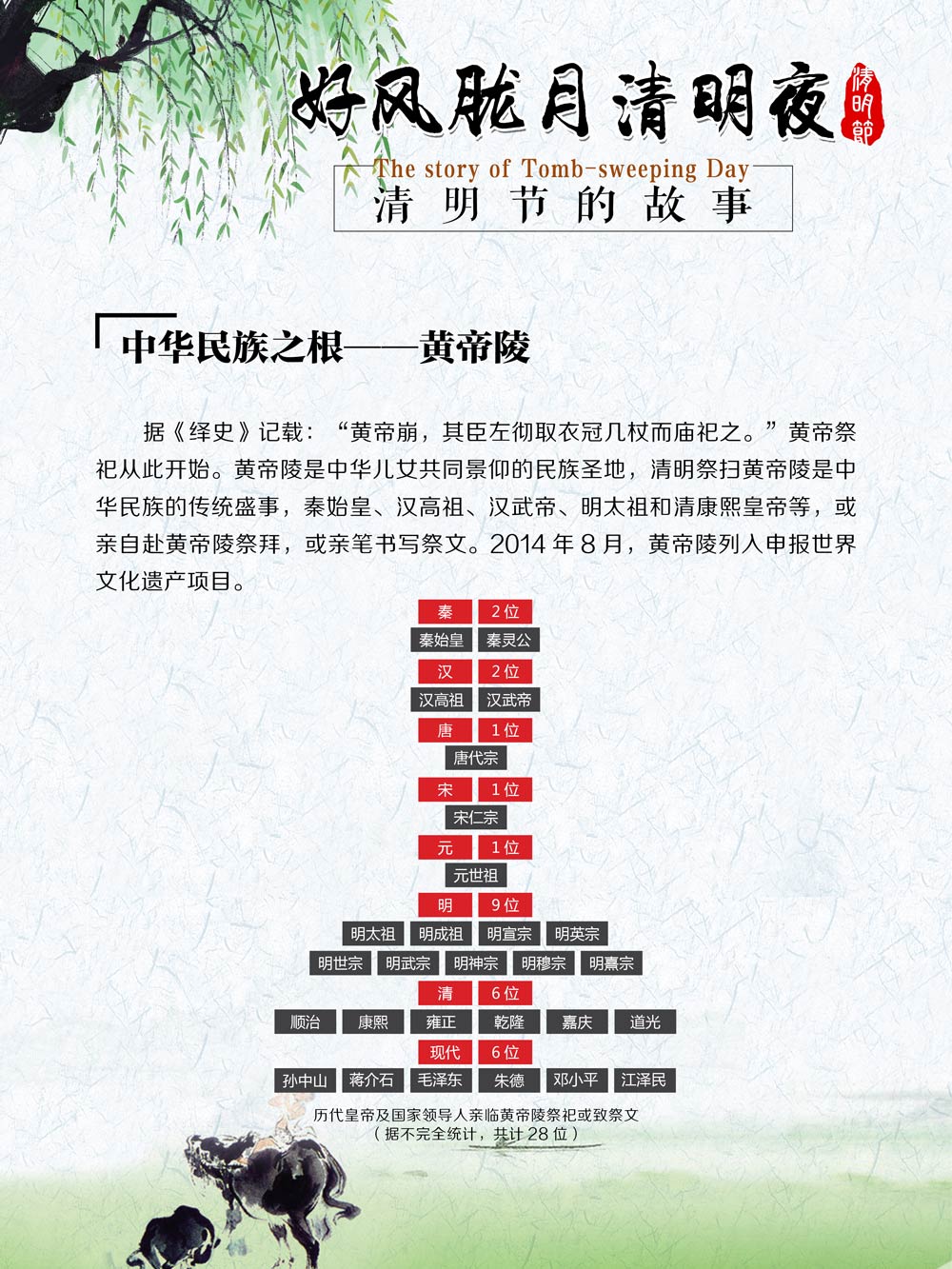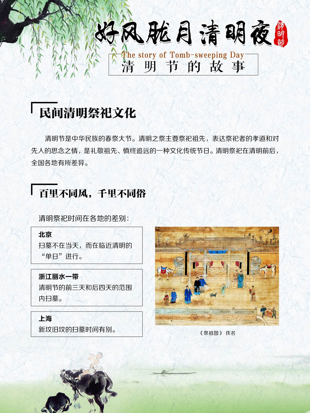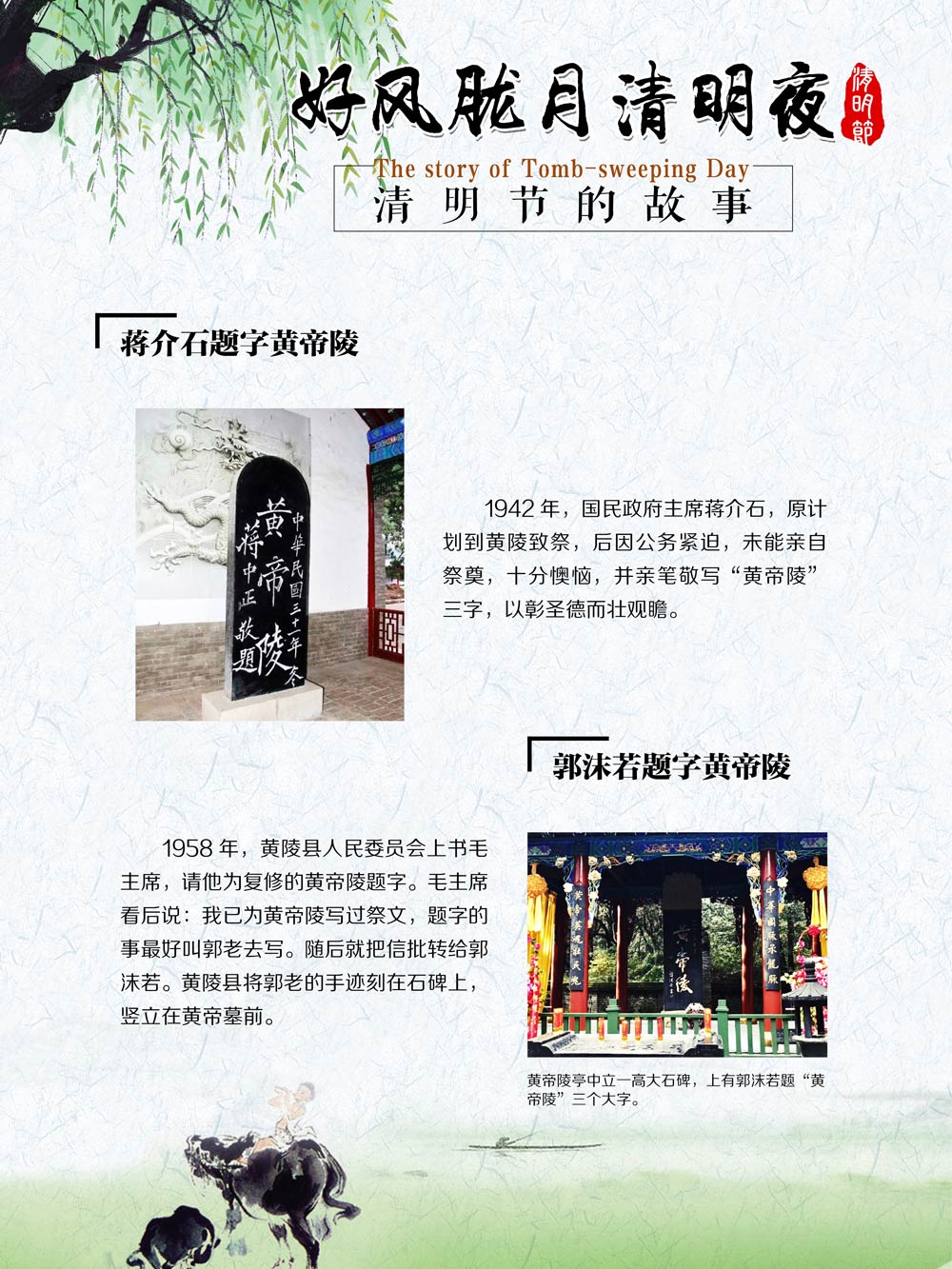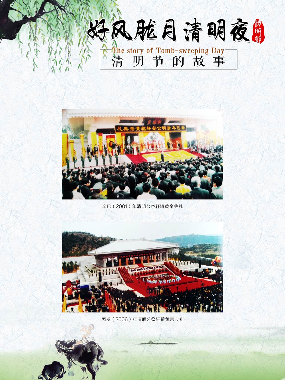《好风胧月清明夜——清明节的故事》主题展览共分为五个单元:“节日溯源 有容乃大”“同归桑梓 慎终追远”“插柳踏春 环保健身”“清明知味 风俗食物”“吟咏绵延 清明永驻”,其中特别策划了“国共两党公祭黄帝陵”、“毛泽东祭黄帝陵文”、“孙中山题词黄帝陵”、国家非物质文化遗产项目“大槐树祭祖习俗”、互动体验“网上祭英烈”和“踏青赏景找不同”六大看点,让您全方位多层次地体验清明节的文化内涵与风姿魅力。 春生孳乳,万物繁炽,天明地洁,气象清朗。时值农历阳春三月,清明节到来之际,我们特别举办此展览,以期在现代文明的催护下,共守传统文化根脉,共勉文明传承重任,为推动社会主义文化繁荣兴盛,贡献我们的智慧和力量。愿清明常在,民族不老。