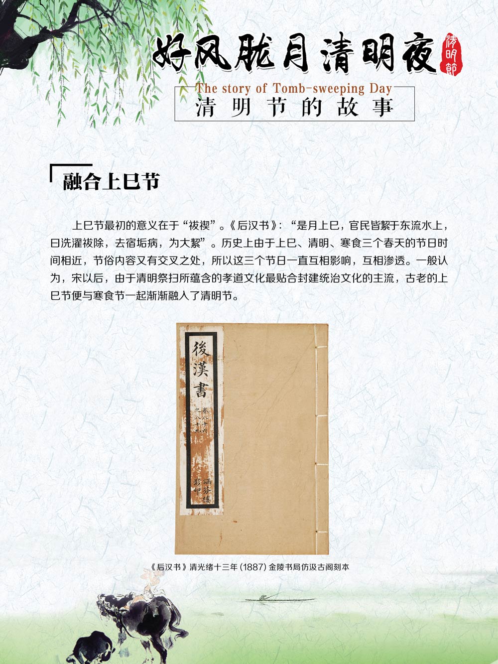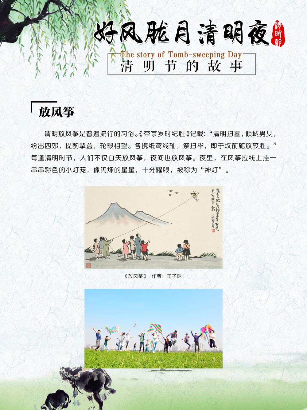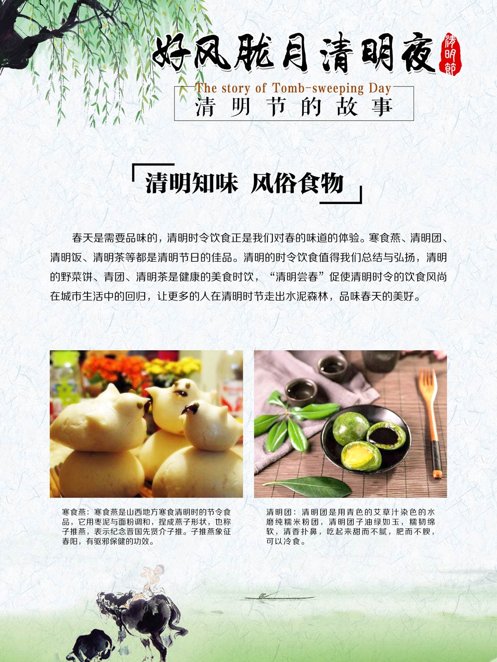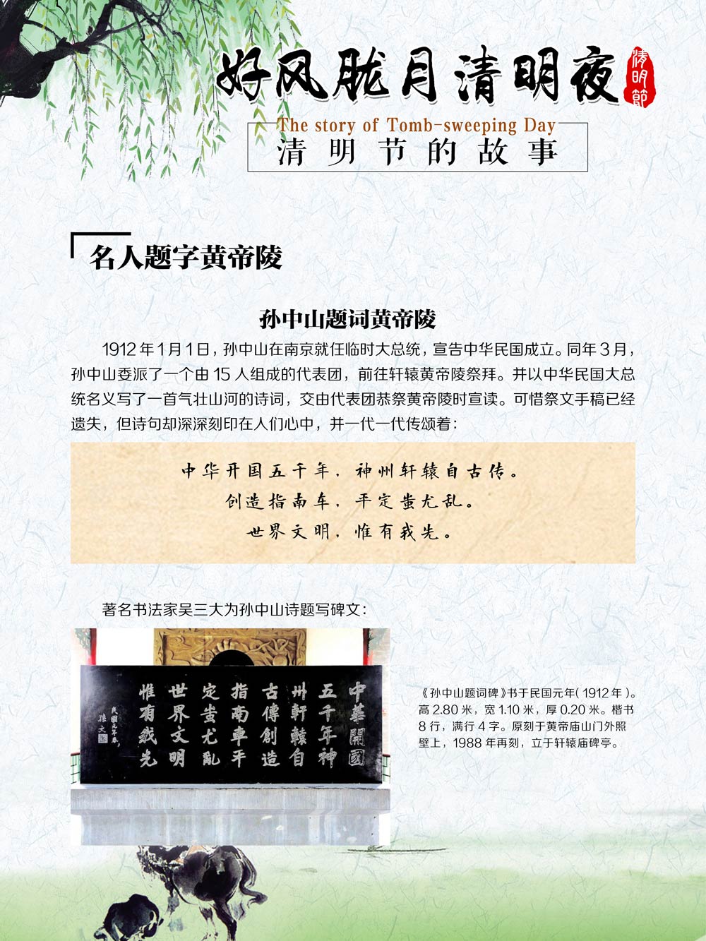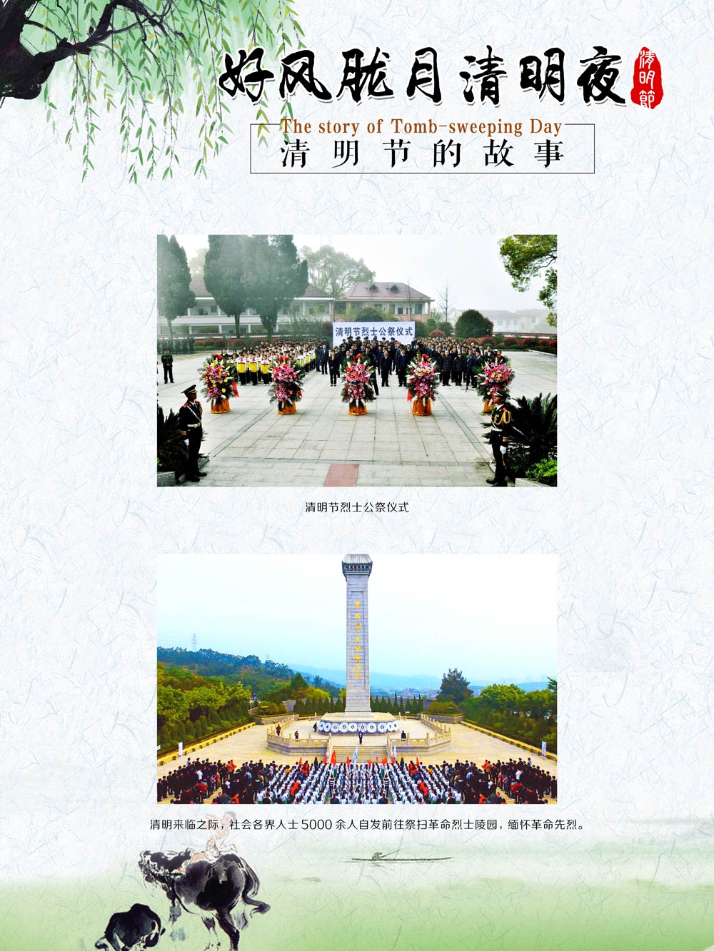 《好风胧月清明夜——清明节的故事》主题展览共分为五个单元:“节日溯源 有容乃大”“同归桑梓 慎终追远”“插柳踏春 环保健身”“清明知味 风俗食物”“吟咏绵延 清明永驻”,其中特别策划了“国共两党公祭黄帝陵”、“毛泽东祭黄帝陵文”、“孙中山题词黄帝陵”、国家非物质文化遗产项目“大槐树祭祖习俗”、互动体验“网上祭英烈”和“踏青赏景找不同”六大看点,让您全方位多层次地体验清明节的文化内涵与风姿魅力。 春生孳乳,万物繁炽,天明地洁,气象清朗。时值农历阳春三月,清明节到来之际,我们特别举办此展览,以期在现代文明的催护下,共守传统文化根脉,共勉文明传承重任,为推动社会主义文化繁荣兴盛,贡献我们的智慧和力量。愿清明常在,民族不老。