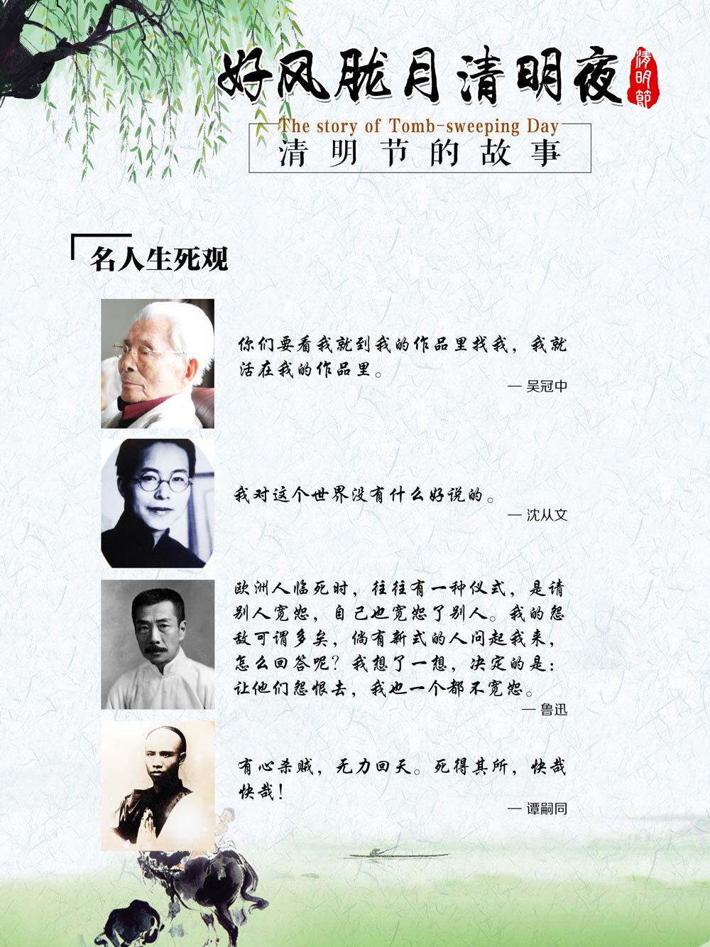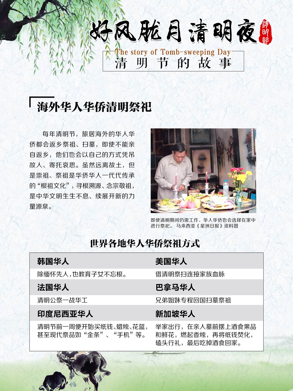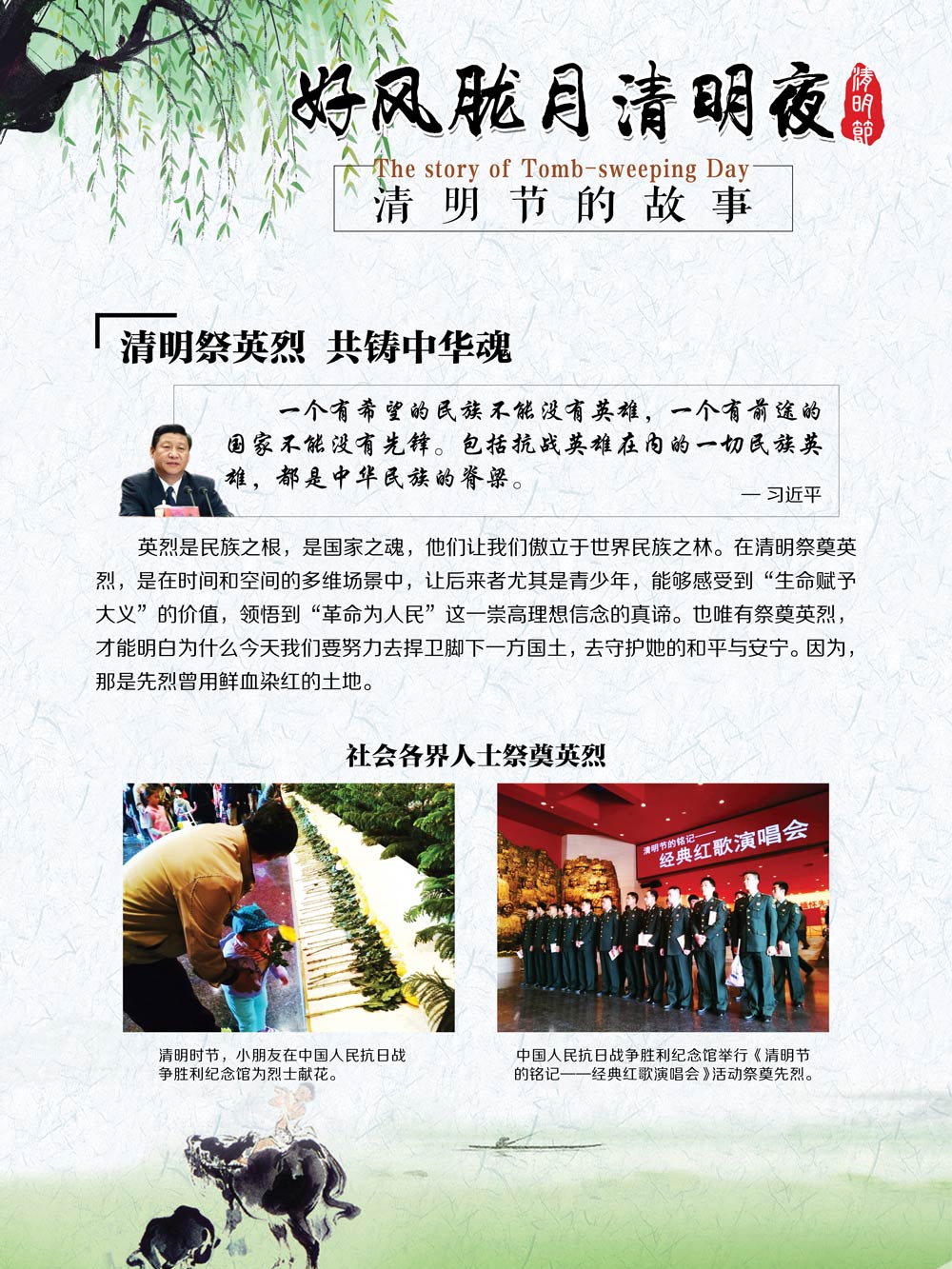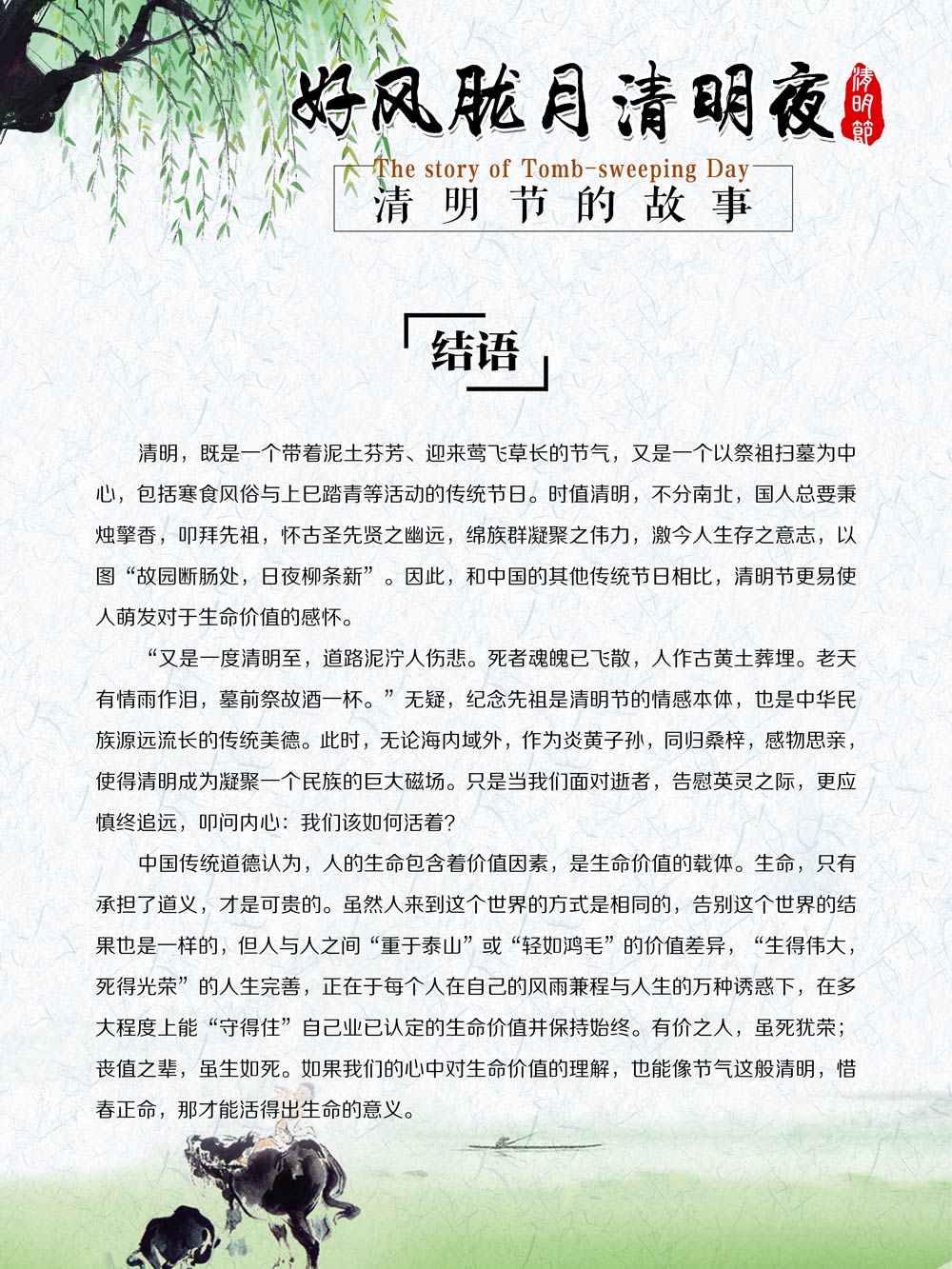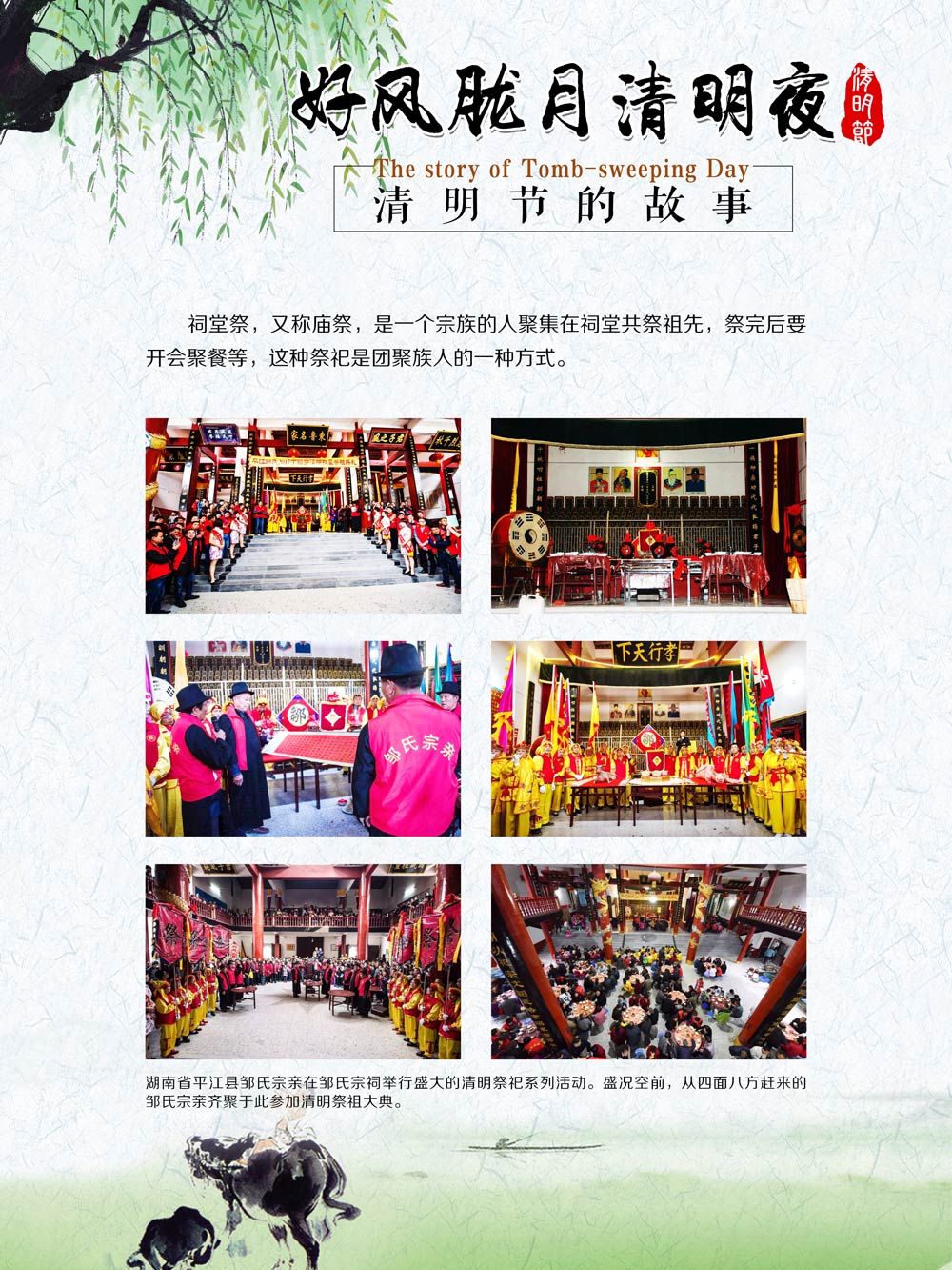 《好风胧月清明夜——清明节的故事》主题展览共分为五个单元:“节日溯源 有容乃大”“同归桑梓 慎终追远”“插柳踏春 环保健身”“清明知味 风俗食物”“吟咏绵延 清明永驻”,其中特别策划了“国共两党公祭黄帝陵”、“毛泽东祭黄帝陵文”、“孙中山题词黄帝陵”、国家非物质文化遗产项目“大槐树祭祖习俗”、互动体验“网上祭英烈”和“踏青赏景找不同”六大看点,让您全方位多层次地体验清明节的文化内涵与风姿魅力。 春生孳乳,万物繁炽,天明地洁,气象清朗。时值农历阳春三月,清明节到来之际,我们特别举办此展览,以期在现代文明的催护下,共守传统文化根脉,共勉文明传承重任,为推动社会主义文化繁荣兴盛,贡献我们的智慧和力量。愿清明常在,民族不老。