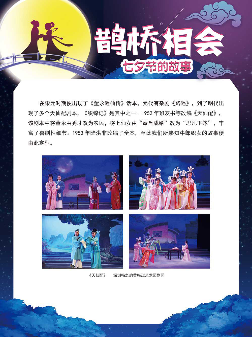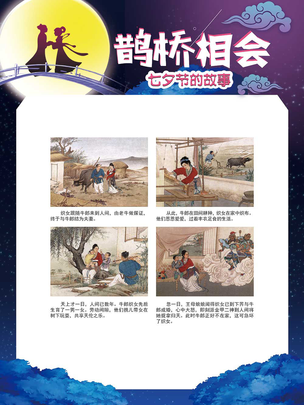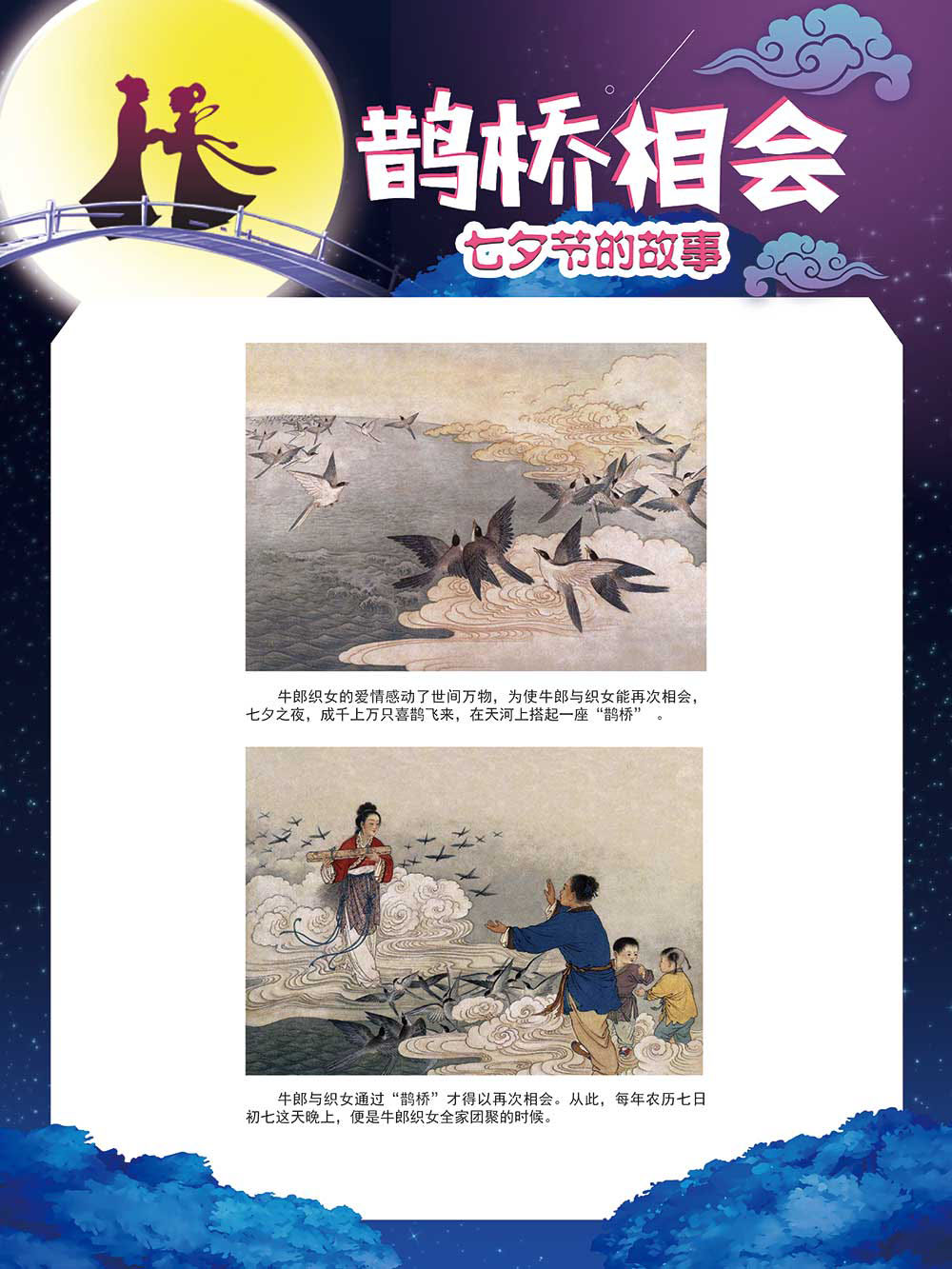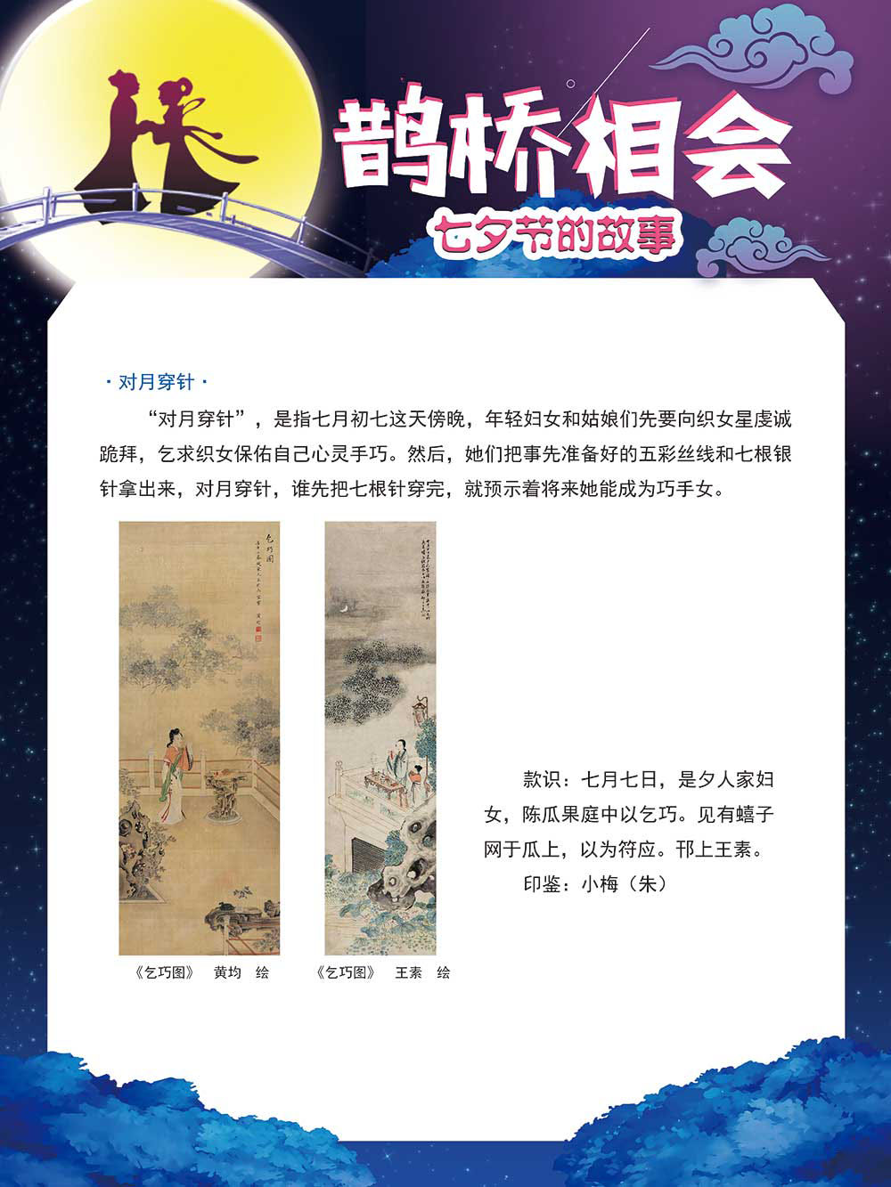 七夕节是中华民族重要的传统节日,在我国民间传统节日中是一个非常具有浪漫色彩的节日。自牛郎织女传说融入七夕节后,牛郎织女鹊桥相会的爱情故事流传千古,深入人心,这也就成为七夕节的主要内容。 2006年七夕节被国务院列入第一批国家级非物质文化遗产名录。“七夕节”是世界上最早的爱情节日,其体现的自由浪漫的爱情观、勤奋朴实的劳动观以及诠释的爱情永恒主题,彰显了传统文化的魅力。七夕文化中的乞巧、祈福活动体现了中华民族勤劳智慧、自强不息、勇于创造,不断追求更加幸福美好生活的精神。 本展览通过国画、连环画、摄影图像和七夕相关的诗歌等内容为您综合介绍七夕节文化内涵,以及民间的各种习俗和当下七夕节的传承和发展。