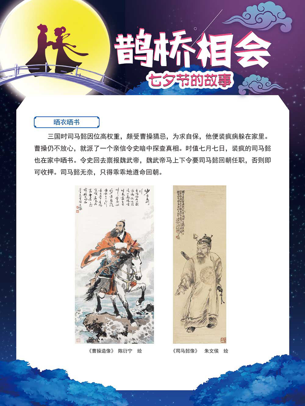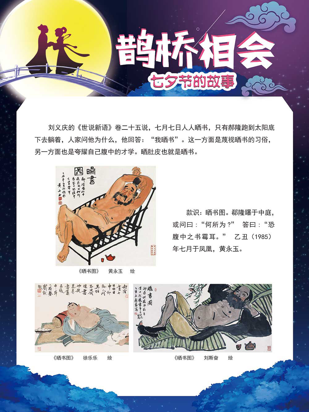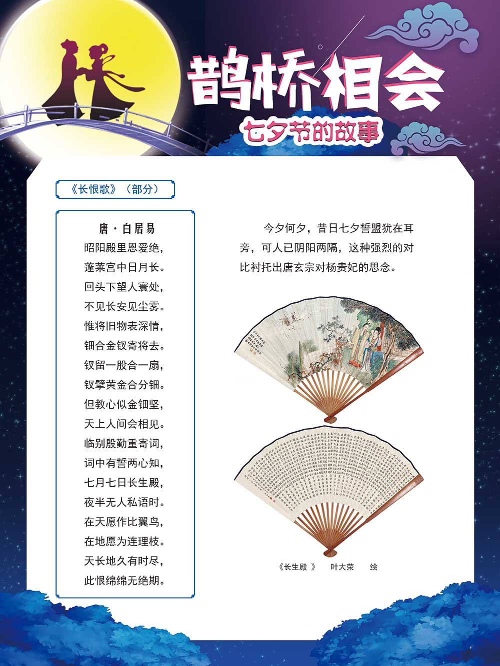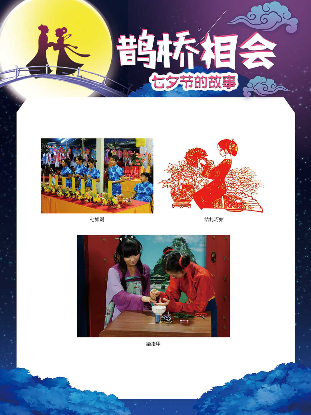 七夕节是中华民族重要的传统节日,在我国民间传统节日中是一个非常具有浪漫色彩的节日。自牛郎织女传说融入七夕节后,牛郎织女鹊桥相会的爱情故事流传千古,深入人心,这也就成为七夕节的主要内容。 2006年七夕节被国务院列入第一批国家级非物质文化遗产名录。“七夕节”是世界上最早的爱情节日,其体现的自由浪漫的爱情观、勤奋朴实的劳动观以及诠释的爱情永恒主题,彰显了传统文化的魅力。七夕文化中的乞巧、祈福活动体现了中华民族勤劳智慧、自强不息、勇于创造,不断追求更加幸福美好生活的精神。 本展览通过国画、连环画、摄影图像和七夕相关的诗歌等内容为您综合介绍七夕节文化内涵,以及民间的各种习俗和当下七夕节的传承和发展。