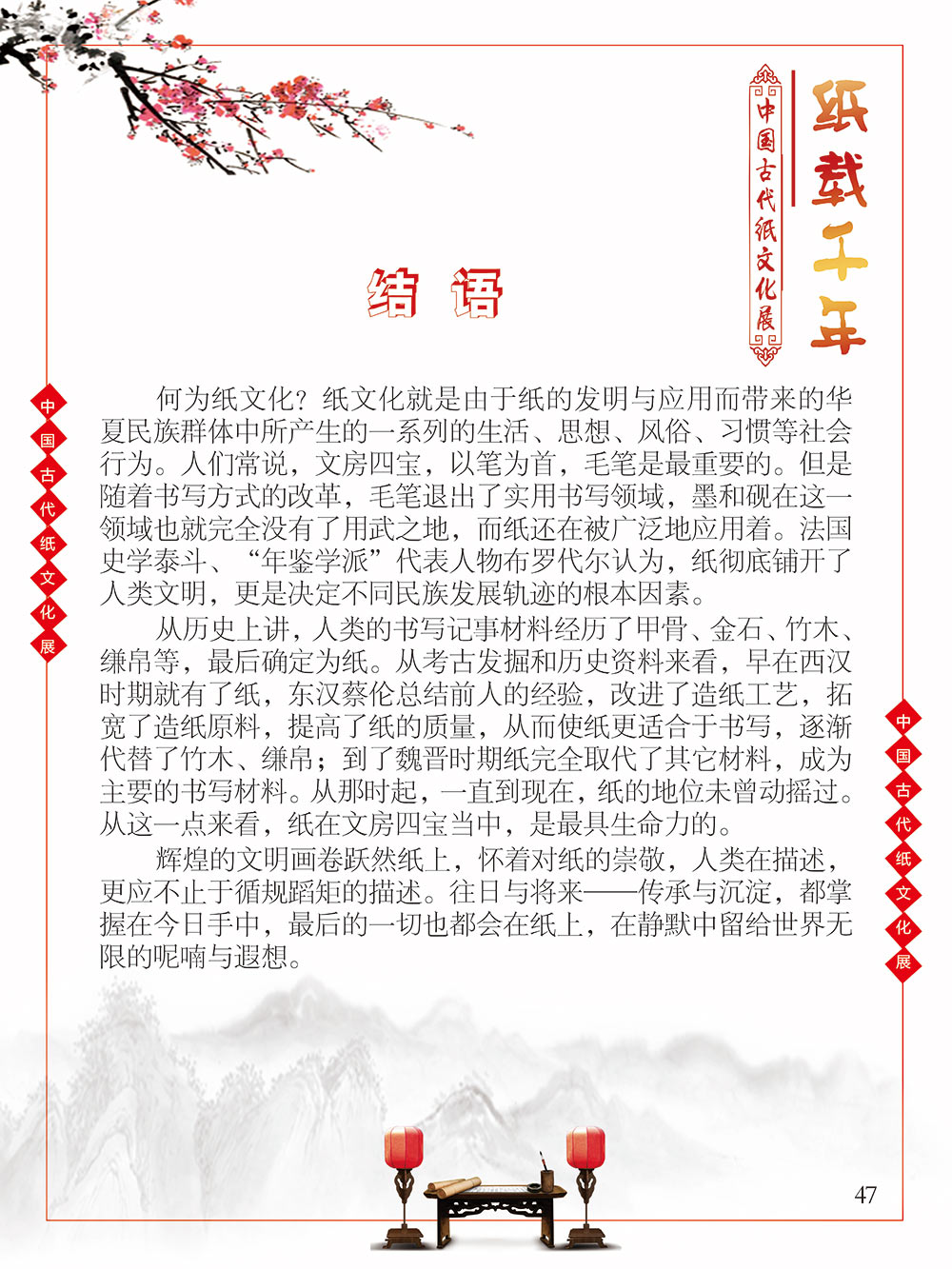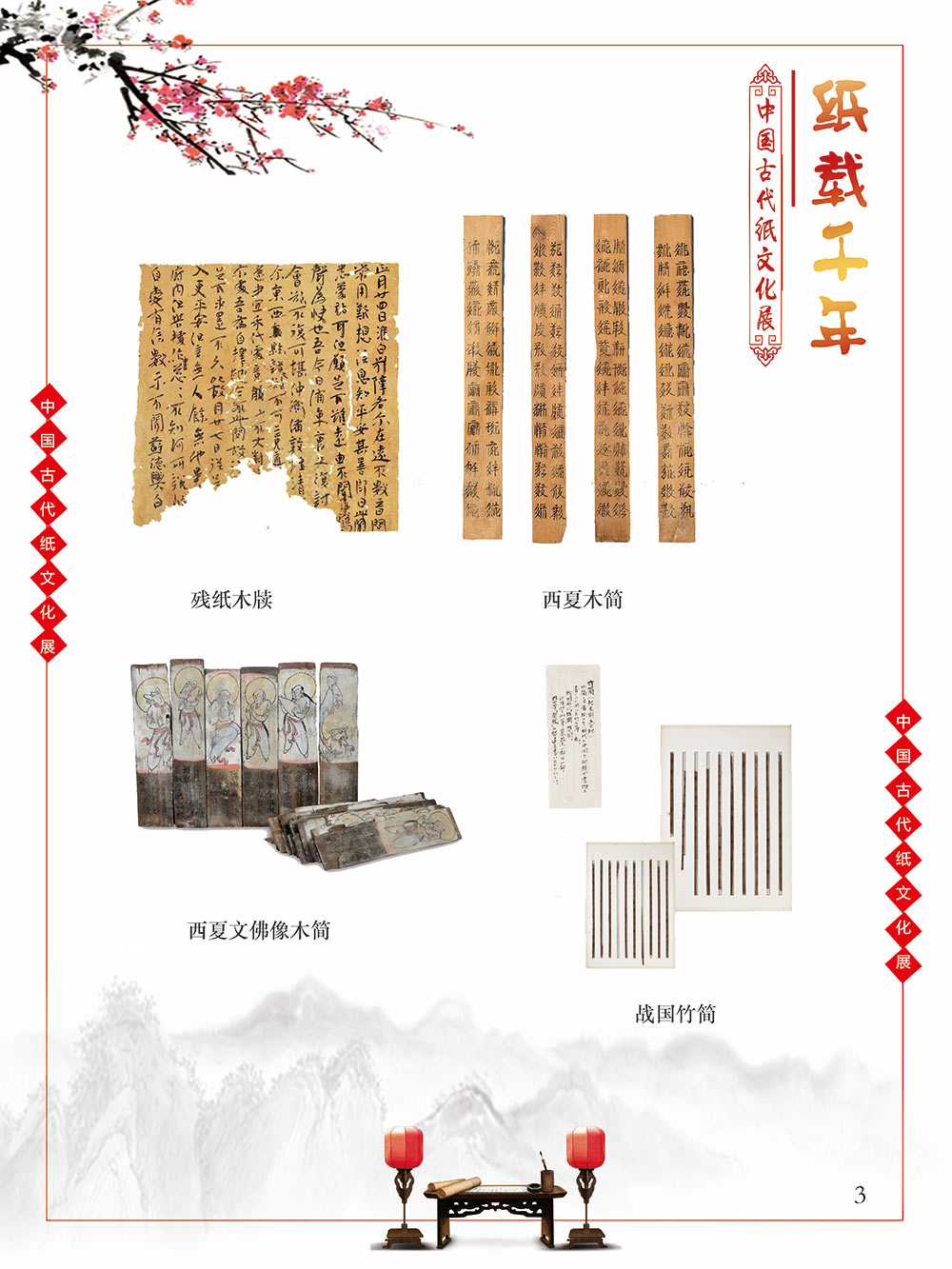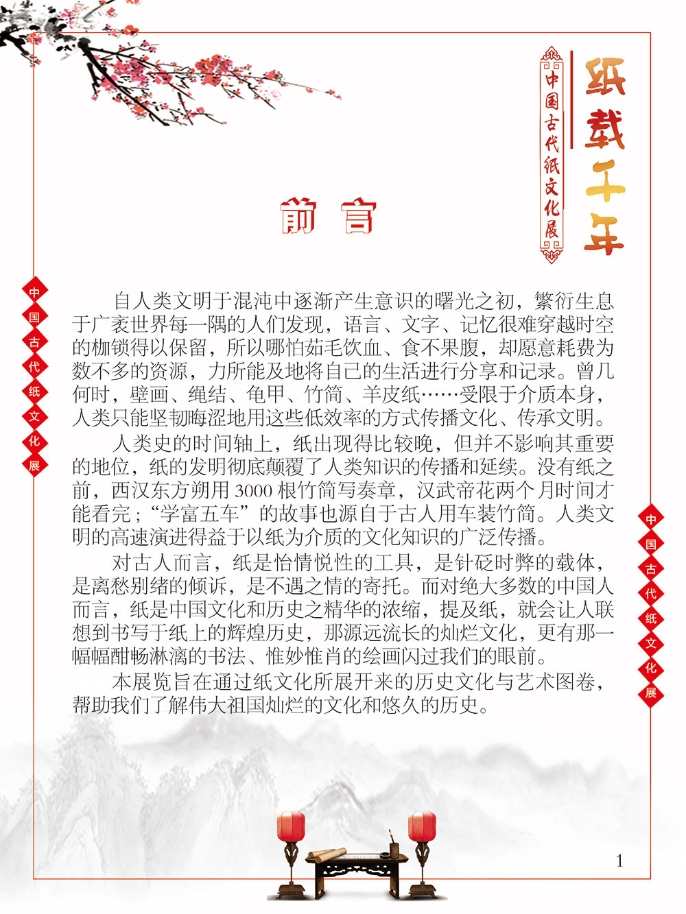 自人类文明于混沌中逐渐产生意识的曙光之初,繁衍生息于广袤世界每一隅的人们发现,语言、文字、记忆很难穿越时空枷锁得以保留,所以哪怕茹毛饮血、食不果腹,却愿意耗费为数不多的资源,力所能及地将自己的生活进行分享和记录。曾几何时,壁画、绳结、龟甲、竹简、羊皮纸……受限于介质本身,人类只能坚韧晦涩地用这些低效率的方式传播文化、传承文明。 人类史的时间轴上,纸出现的比较晚,但并不影响其重要的地位,纸的发明彻底颠覆了人类知识的传播和延续。没有纸之前,西汉东方朔用3000根竹简写奏章,汉武帝花两个月时间才能看完;“学富五车”的故事也源自于古人用车装竹简。人类文明的高速演进得益于以纸为介质的文化知识的广泛传播。 对古人而言,纸是怡情悦性的工具,是针砭时弊的载体,是离愁别绪的倾诉,是不遇之情的寄托。而对绝大多数的中国人而言,纸,是中国文化和历史之精华的浓缩,提及纸,就会让人联想到书写于纸上的辉煌历史,那源远流长的灿烂文化,更有那一幅幅酣畅淋漓的书法、惟妙惟肖的绘画闪过我们的眼前。 本展览旨在通过纸文化所展开来的历史文化与艺术图卷,帮助我们了解伟大祖国灿烂的文化和悠久的历史。