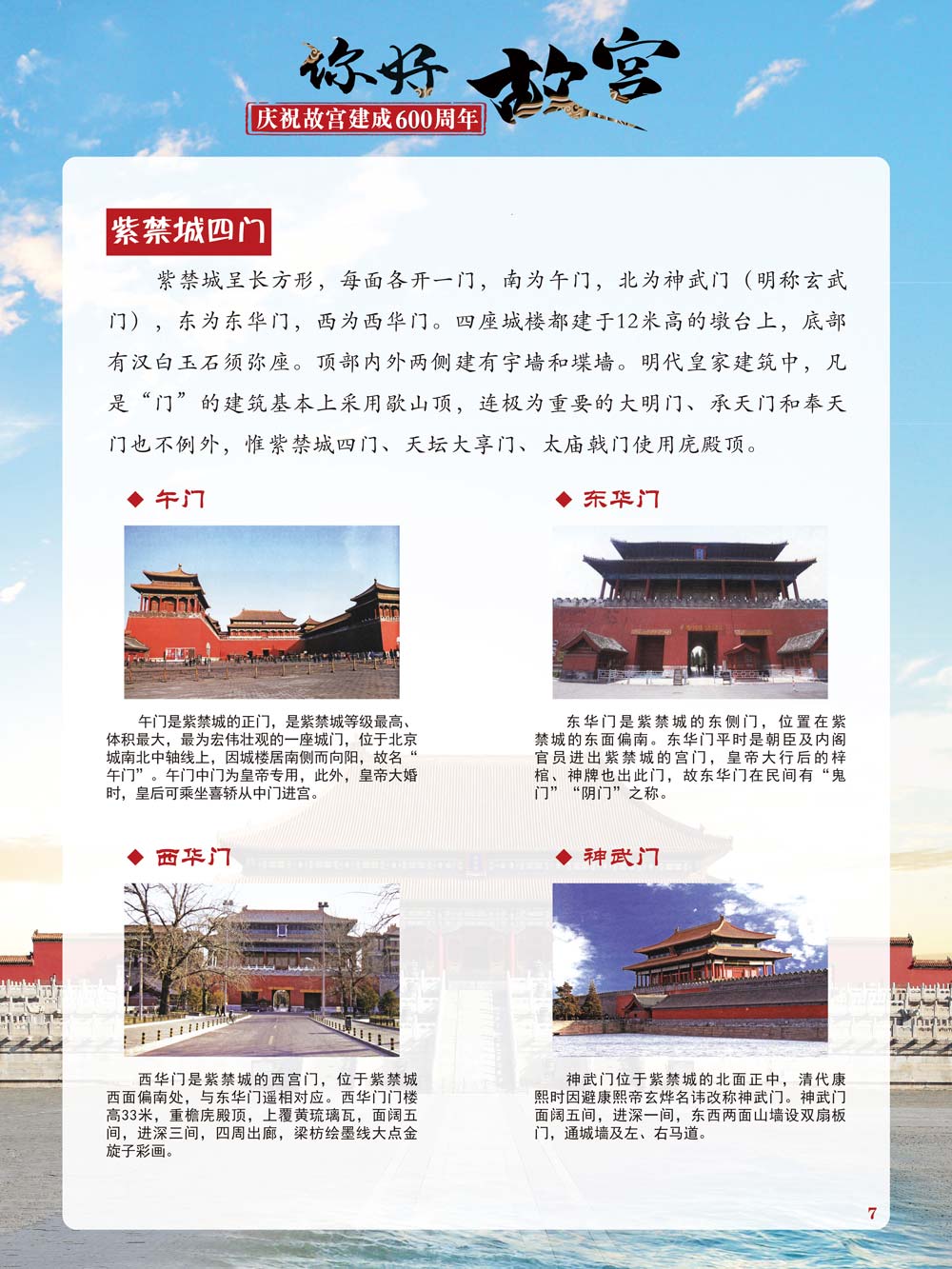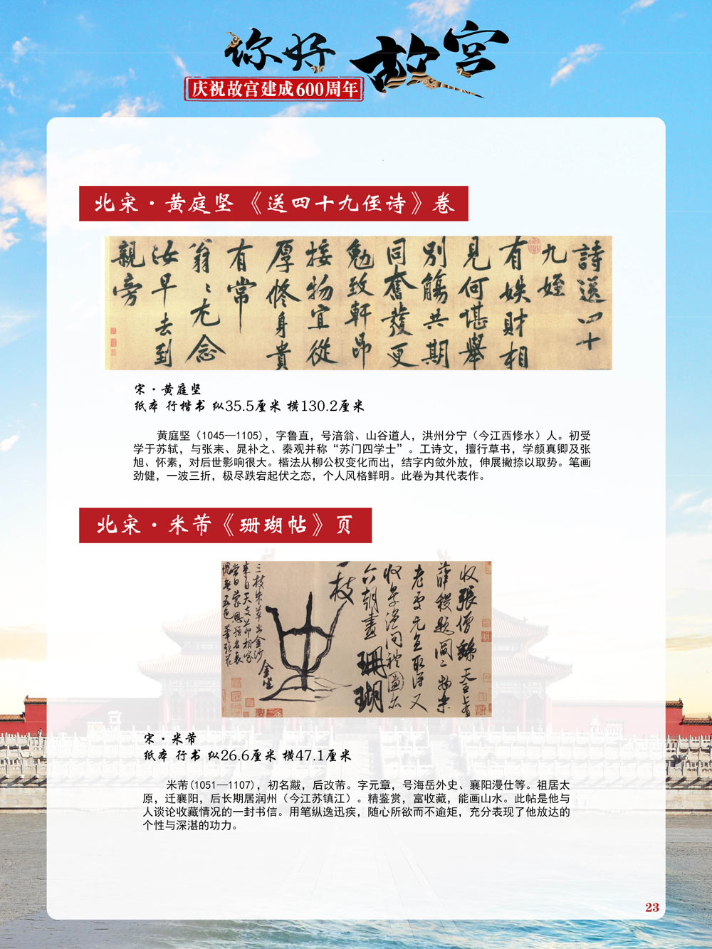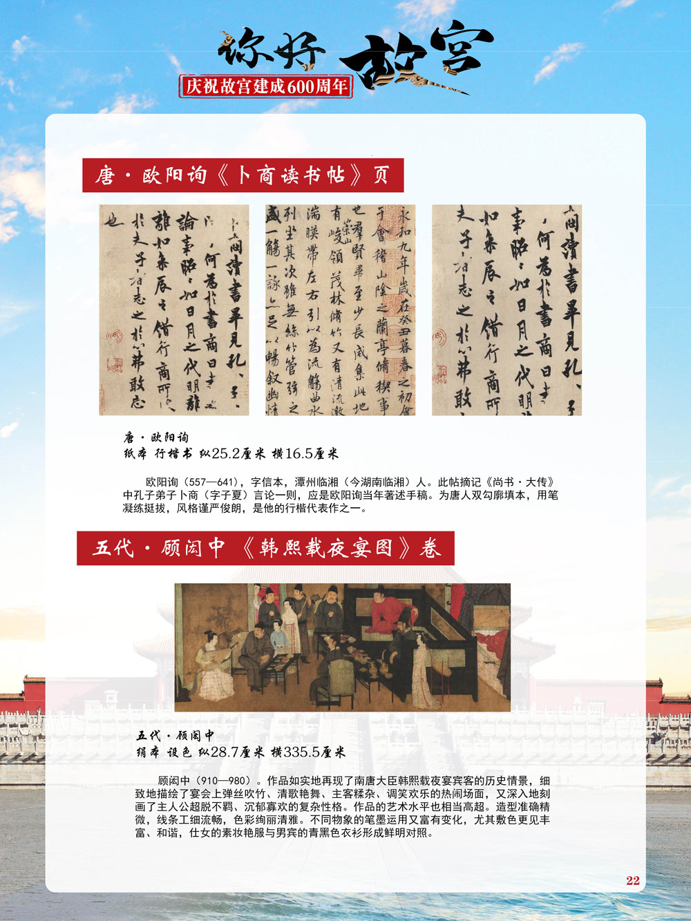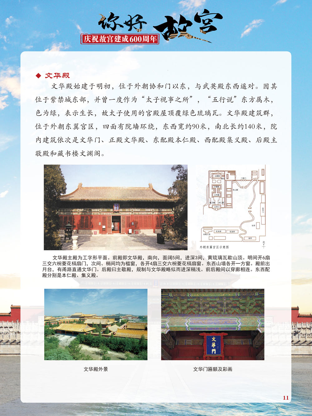故宫是了解中国历史文化不可或缺的窗口。它其实有两个名字,一个名叫故宫博物院,90多岁了;一个名叫紫禁城,今年整整600岁了。 历史文物承载着一个民族的灿烂文明,本展览立足于故宫建成600周年,通过介绍故宫的建筑、字画、陶瓷,让观众不仅可以欣赏精美的文物,还可以在历史的氛围中徜徉传承和发扬中华优秀传统文化。故宫的每一座宫殿建筑、朱漆大门、院落桥梁、青砖黄瓦、宫廷陈设、梁枋彩画,承载着丰富的历史符号、文化内涵。书画藏品是故宫博物院艺术藏品的重中之重,阎立本《步辇图》,张择端《清明上河图》,王羲之、欧阳询等名家书法成为故宫镇院之宝。陶瓷,是文明的象征,每件作品背后的文化因素,让造型、釉色和装饰纹样呈现出丰富多元的面貌。陶瓷吸引人之处,在于它们呼应着源远流长的历史脉络,同时也反映出不同文化相互交流的现象。