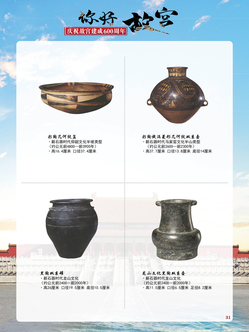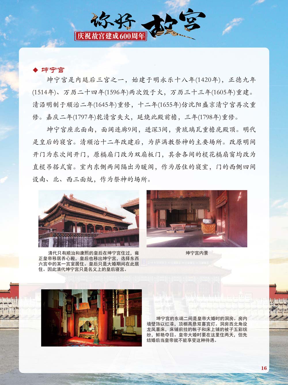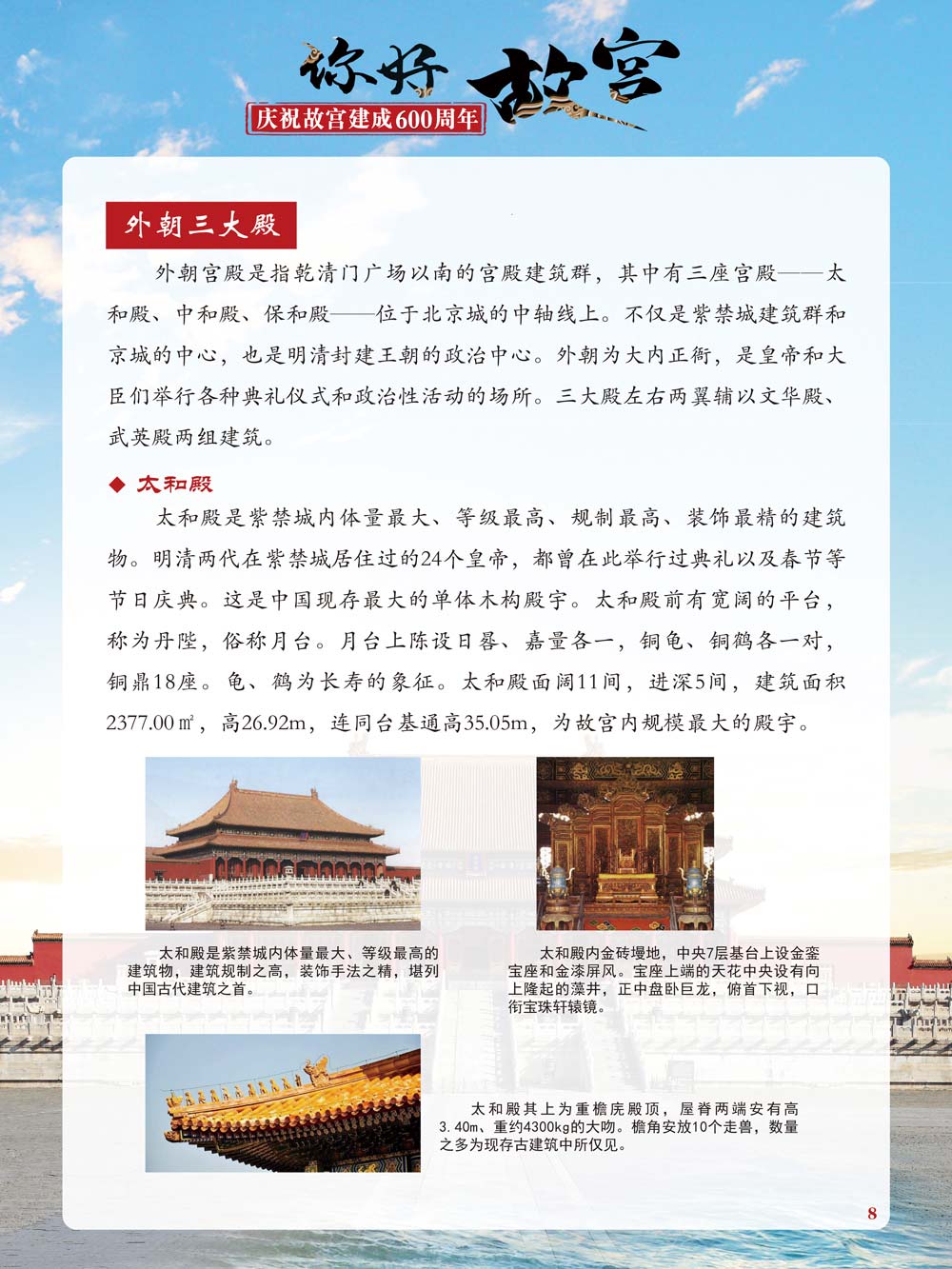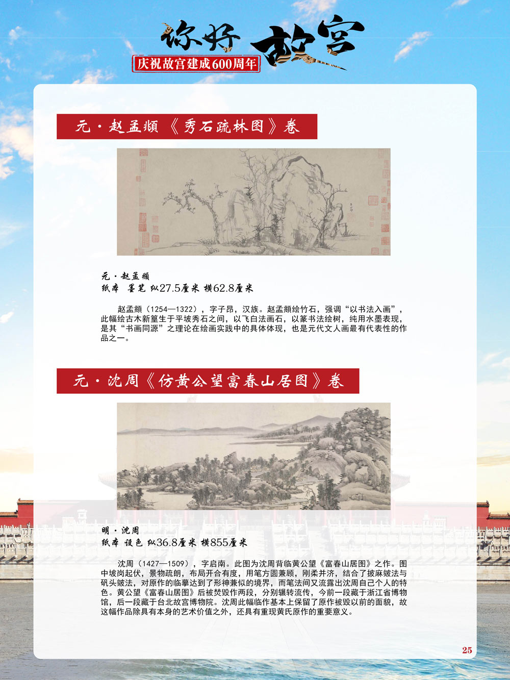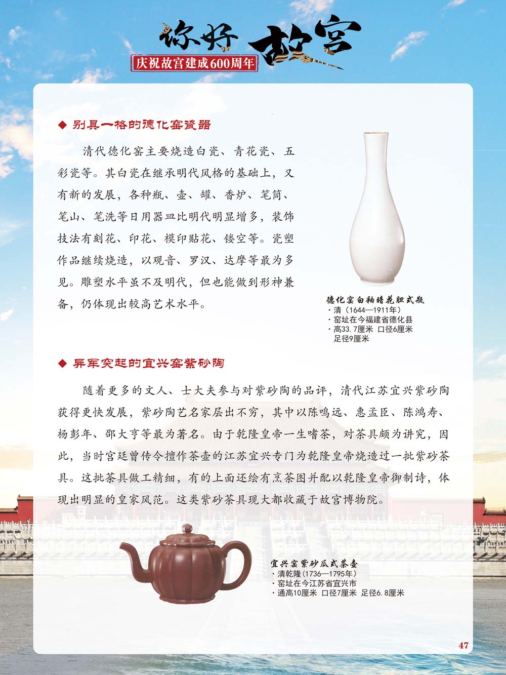 故宫是了解中国历史文化不可或缺的窗口。它其实有两个名字,一个名叫故宫博物院,90多岁了;一个名叫紫禁城,今年整整600岁了。 历史文物承载着一个民族的灿烂文明,本展览立足于故宫建成600周年,通过介绍故宫的建筑、字画、陶瓷,让观众不仅可以欣赏精美的文物,还可以在历史的氛围中徜徉传承和发扬中华优秀传统文化。故宫的每一座宫殿建筑、朱漆大门、院落桥梁、青砖黄瓦、宫廷陈设、梁枋彩画,承载着丰富的历史符号、文化内涵。书画藏品是故宫博物院艺术藏品的重中之重,阎立本《步辇图》,张择端《清明上河图》,王羲之、欧阳询等名家书法成为故宫镇院之宝。陶瓷,是文明的象征,每件作品背后的文化因素,让造型、釉色和装饰纹样呈现出丰富多元的面貌。陶瓷吸引人之处,在于它们呼应着源远流长的历史脉络,同时也反映出不同文化相互交流的现象。