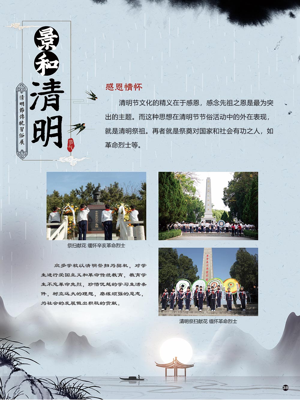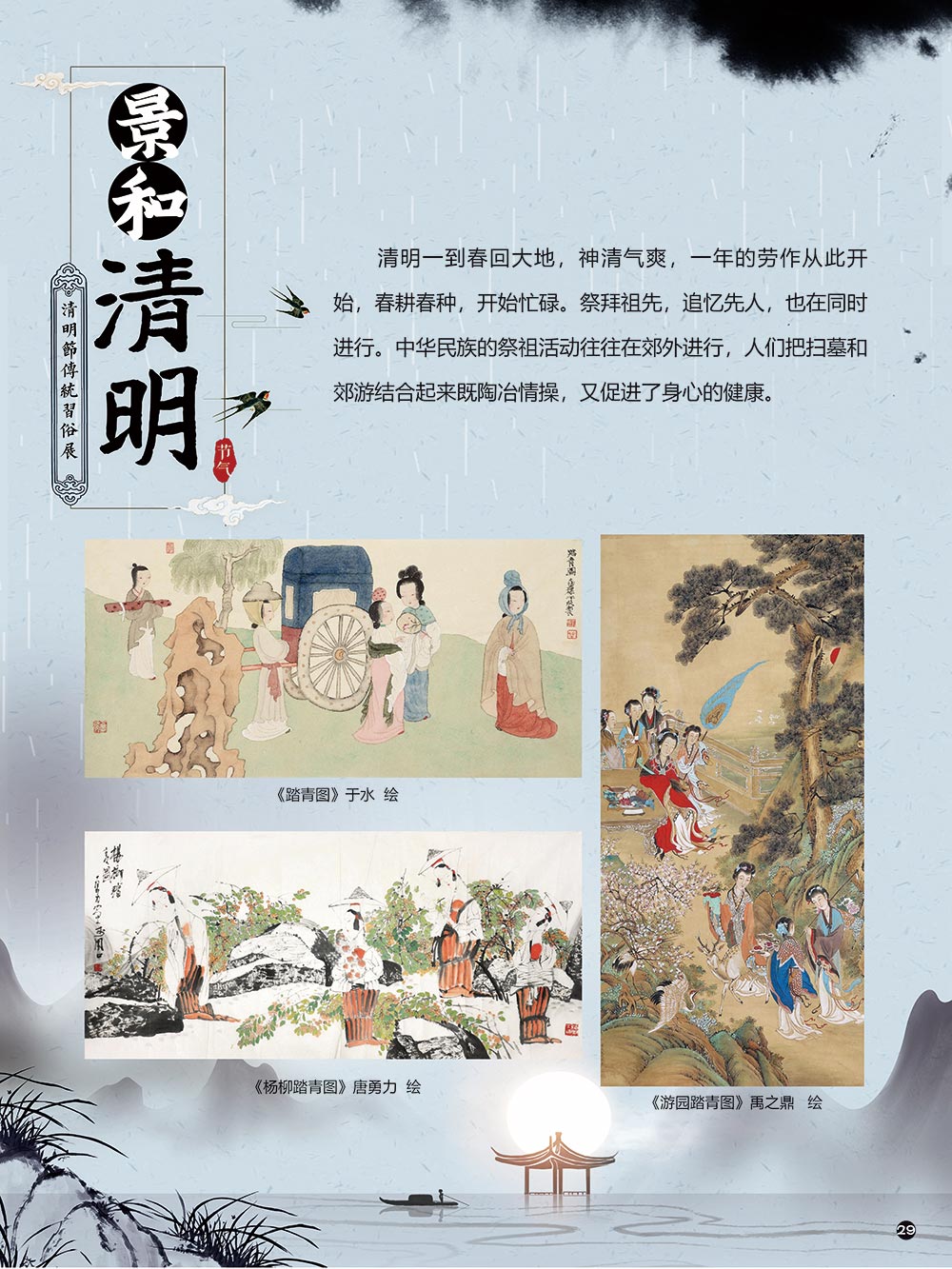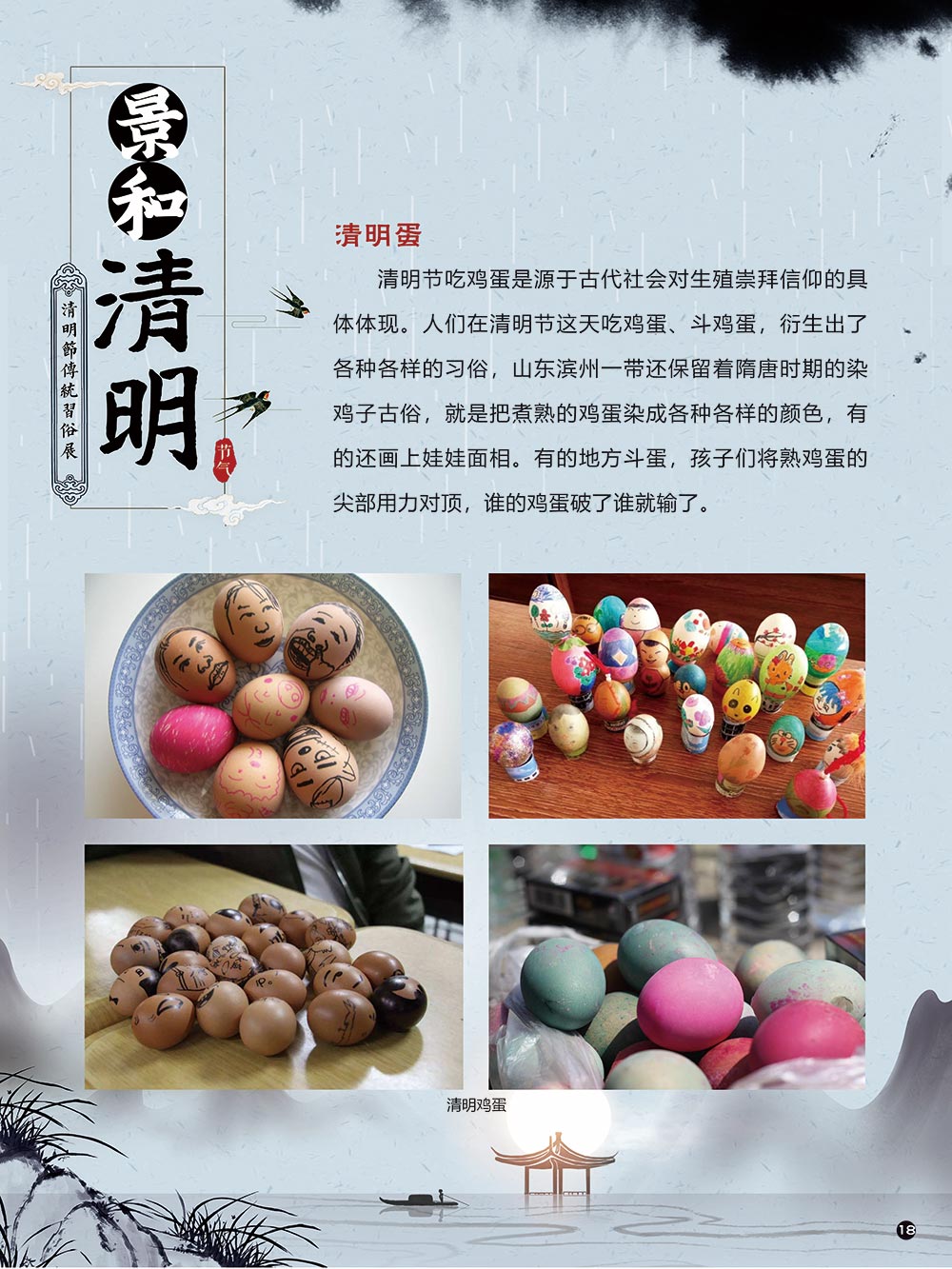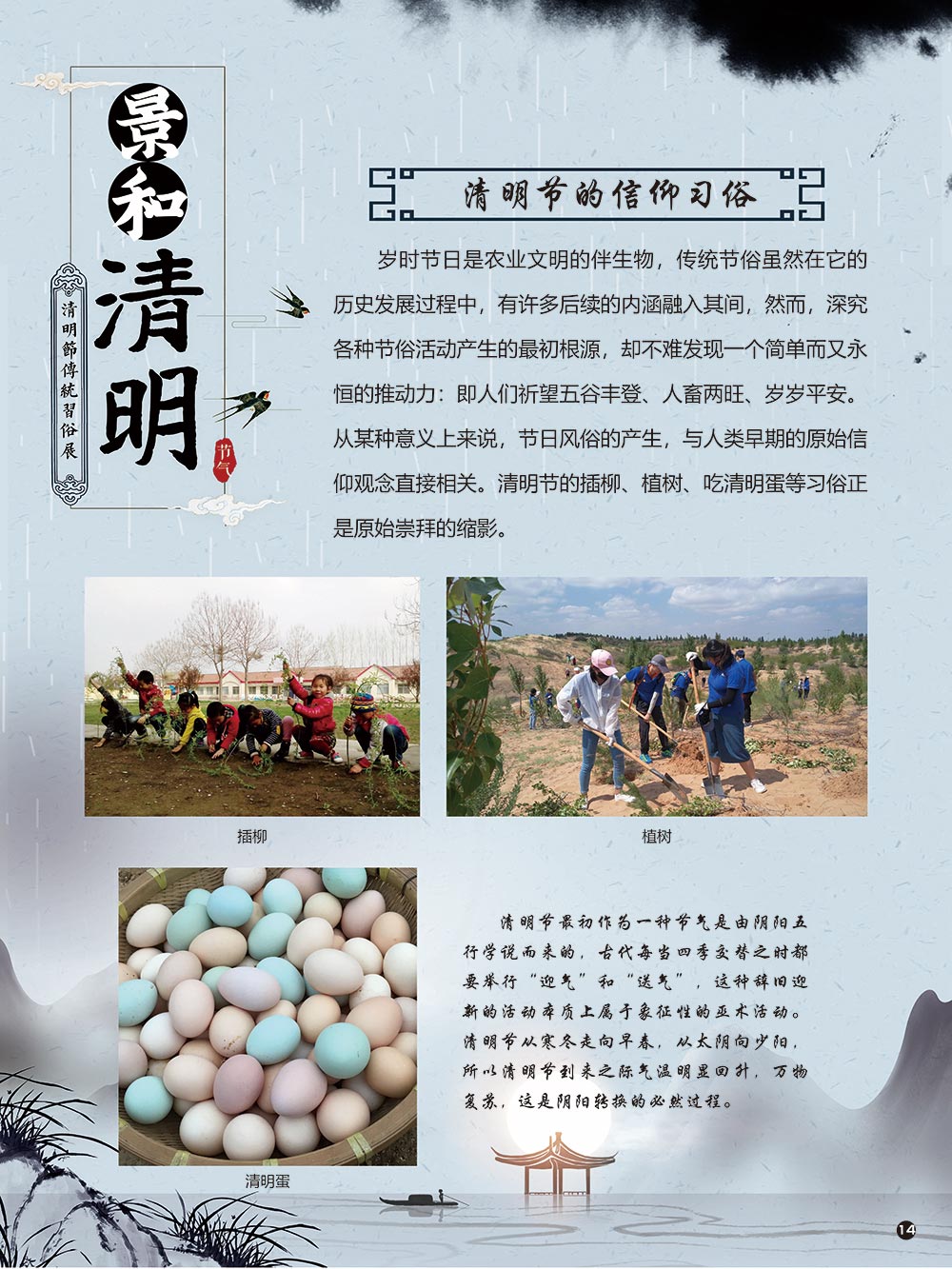 清明节是中华民族传统节日中一个由节气命名的节日。清明节的文化内涵传承着中华民族独特的精神与情感。古往今来,清明节作为中国忠孝文化的载体,对家庭的尊崇,对祖先的感恩,对血脉责任的认同,使其在我国民俗节日体系中具有不可替代的地位。 清明节蕴含着我国优秀的民族文化,承载着我国民众的伦理观念、审美情趣、道德信仰和社会风俗。 在上千年的历史发展中,清明节这一古老的传统节日,随时代而变化。尤其是在当今社会,清明节的发展呈现出新态势。如政府组织学校或单位在清明节去革命烈士陵园扫墓,缅怀为新中国浴血奋战的革命先烈;数以万计的海外侨胞在清明节回国,祭拜人类始祖轩辕黄帝。 2006年5月20日,文化部申报的清明节经国务院批准列入第一批国家级非物质文化遗产名录。清明节习俗甚多,全国各地因地域文化不同而又存在着习俗内容上或细节上的差异,各地习俗虽不尽相同,但扫墓祭祖、踏青郊游是共同的基本节俗主题。展览主要介绍清明节的起源及发展和习俗文化,以此讲述清明节日故事,弘扬传统文化。