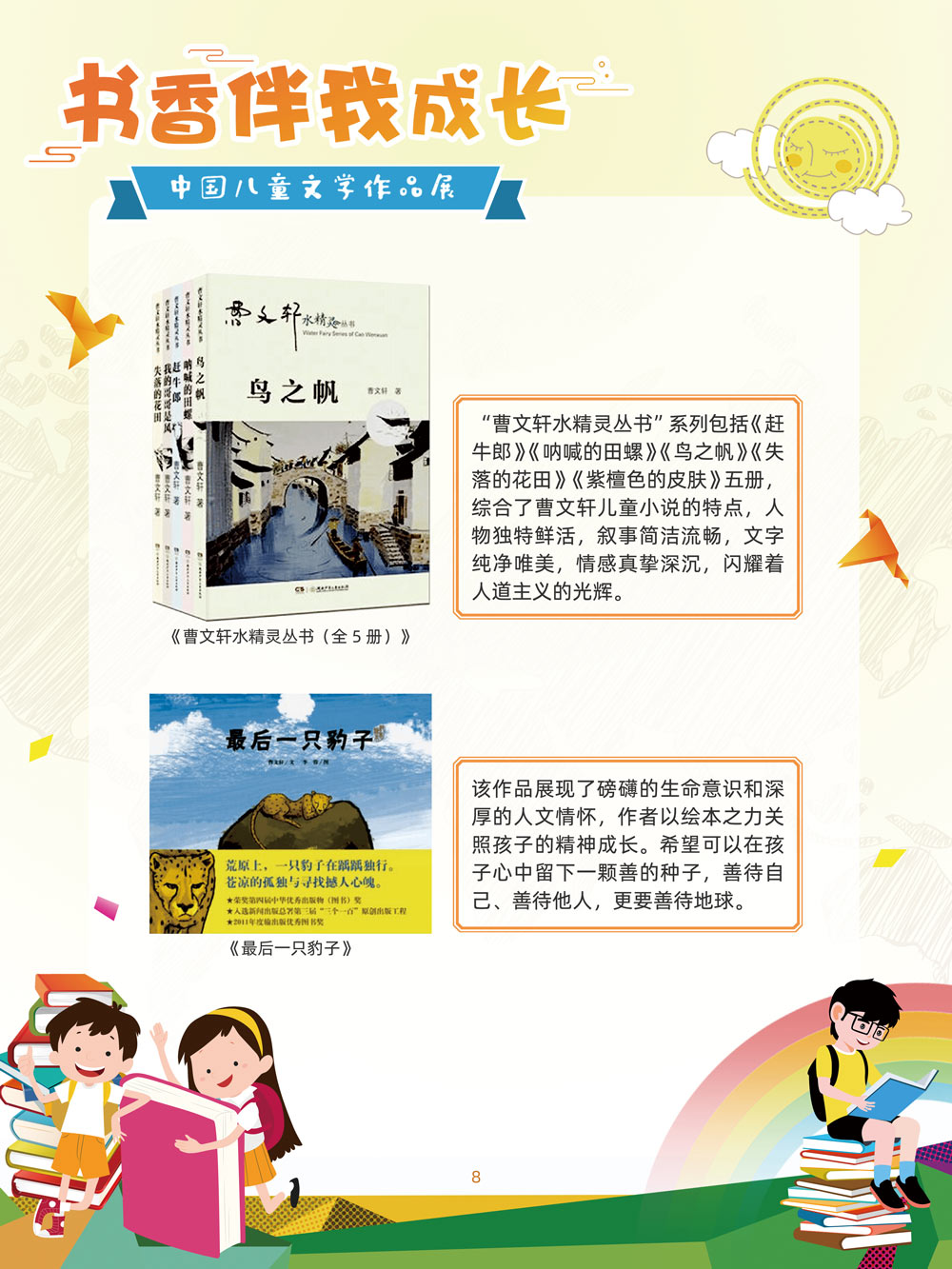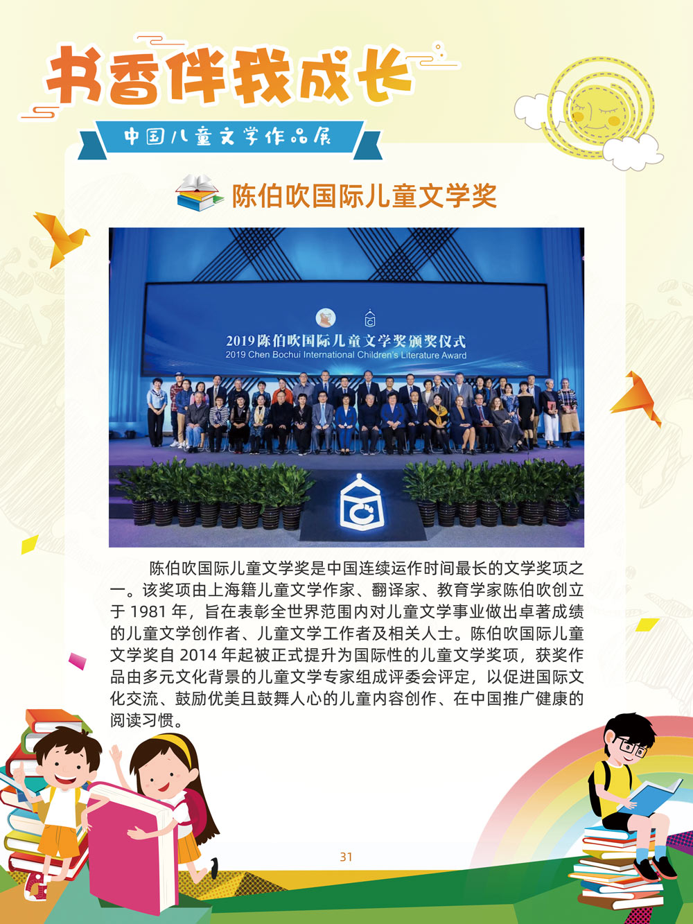 人之初,性本善。儿童文学是人生最早接受的文学。那些曾经深深感动过少年儿童的作品,将使人终身难忘,终生受惠。在今天这个传媒多元的时代,我们特别需要向广大少年儿童提倡文学阅读。 对孩子来说,一本好书,在带给他们欢笑与感动的同时,也可以帮助他们搭建起一个丰富多彩的心灵世界,以文字为窗口,孩子们可以凭窗远眺,放眼望去,皆是瑰丽多姿的世间万物。 以童趣笔调,描孩子的天真生活,以新颖视角,投射孩子的奇妙想象,在这些趣味盎然的书籍里,我们陪伴孩子一起阅读思考,探索认识这个世界的温柔与善良。 在“六一”儿童节到来之际,此次展览将最好的儿童文学作品介绍给广大少年儿童通过介绍荣获国际安徒生奖、国家图书奖、宋庆龄儿童文学奖、冰心儿童文学新作奖、陈伯吹国际儿童文学奖、全国儿童文学奖的部分优秀获奖作品,让孩子们通过阅读,赏和领略不同文学大师的风格,感受各种儿童文学大奖作品的魅力,寻找记忆深处的纯真,也让这些儿童文化作品点亮孩子们的梦想。