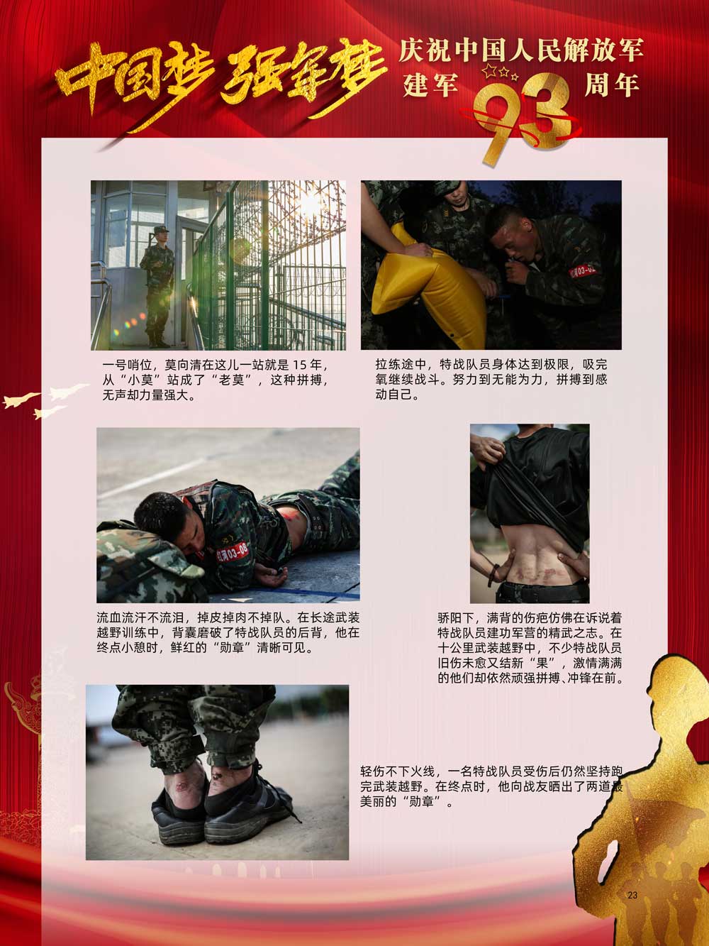 中国梦,强军梦。同根生,同心圆。 在十九大报告中有一句重要的表述,实现中国梦强军梦,把中国梦和强军梦放在一起表述和推进。在新时代国家安全形势面临着复杂严峻的局面,我们要实现中华民族伟大复兴的中国梦,对安全需求、安全保障提出了更高的要求。在这样一个背景下,建设强大军队的历史任务就前所未有地提出了。 中国梦和强军梦,是相互支持、相互支撑的关系。中国梦为强军梦提供强大的支撑,因为我们国家如果不能富强,我们就不可能有足够的资源来用于国防和军队建设。所以建设一支强大的军队必须要以中国梦的实现、要以国家的富强来作为前提,只有“富国强军”,中国梦最终才能实现。强军是中华民族伟大复兴的重要基石。富国和强军是中华民族伟大复兴的两大基石。富国是强军的基本依托,强军是富国的安全保障。强军梦不圆,中国梦也难圆。雄厚的经济实力是一个国家强大的基础,但倘若没有相应的国防实力和军事能力作后盾,经济实力再强大也不能成就真正意义上的中国梦。 今年是中国人民解放军建军93年,为庆祝中国人民解放军建军93周年,我们特别策划本展览,向您介绍中国梦强军梦的理论关系,介绍习近平强军的思想,向您展示中国人民解放军刻苦训练的飒爽英姿和自主创新的国产武器,以及其乐融融的军民鱼水情。