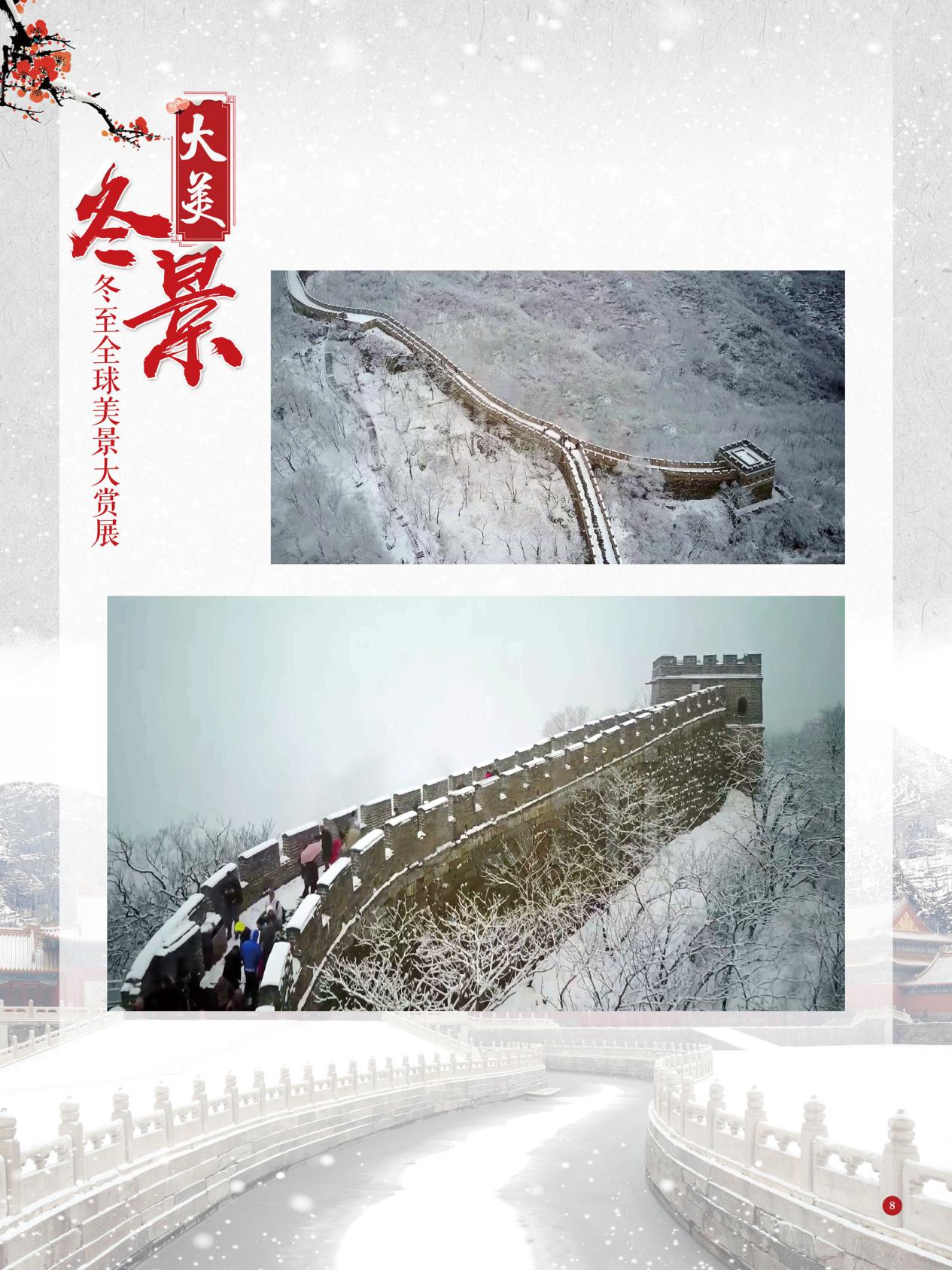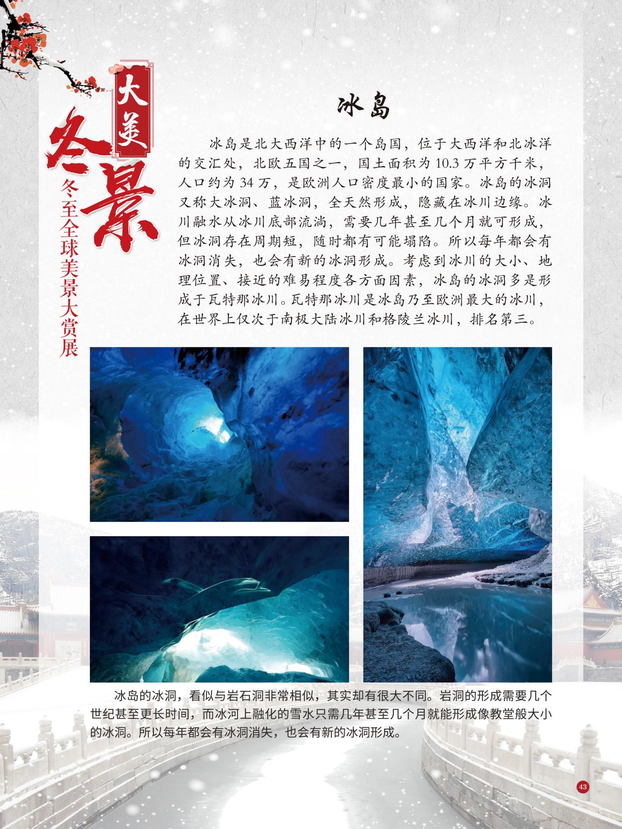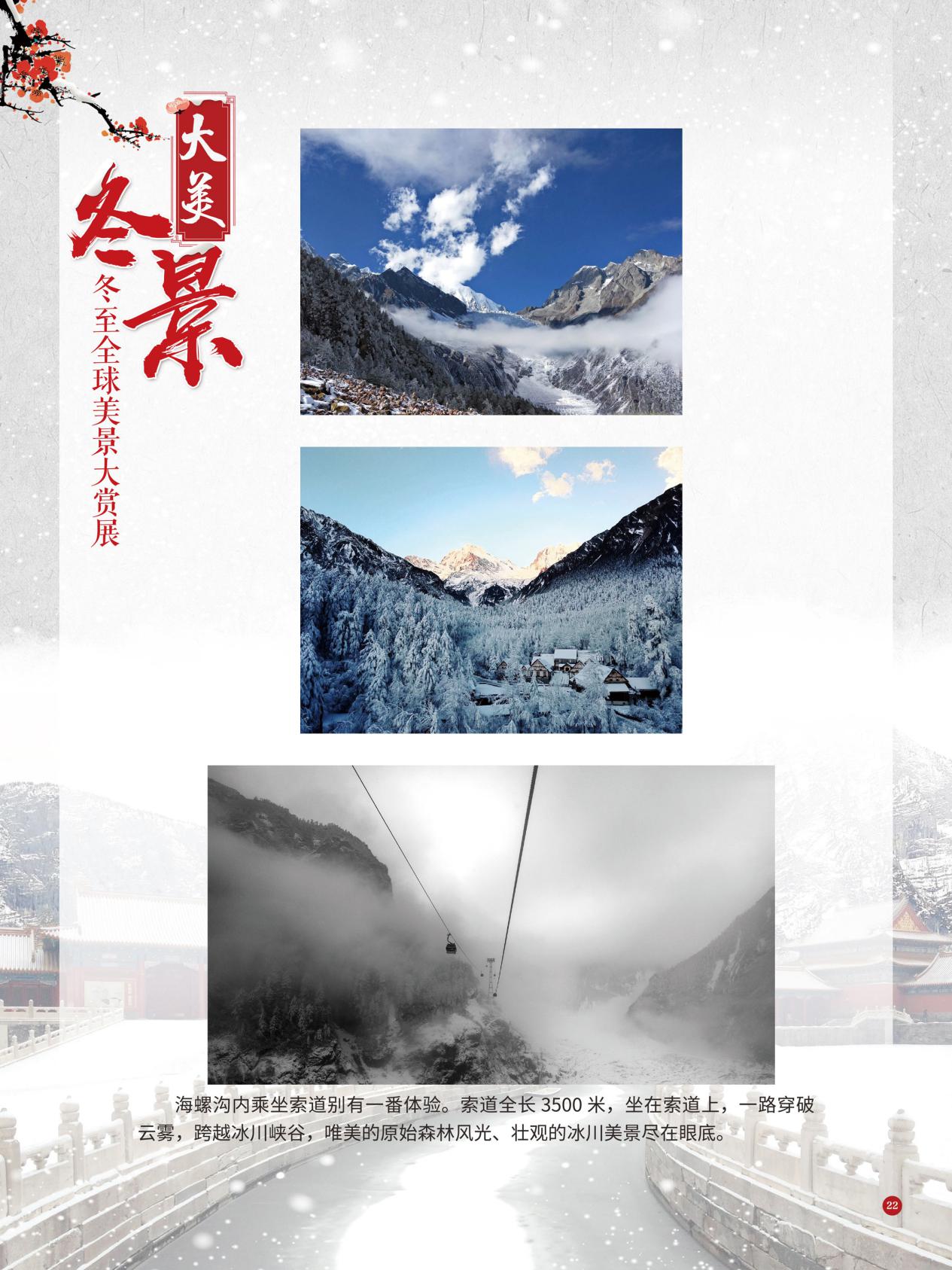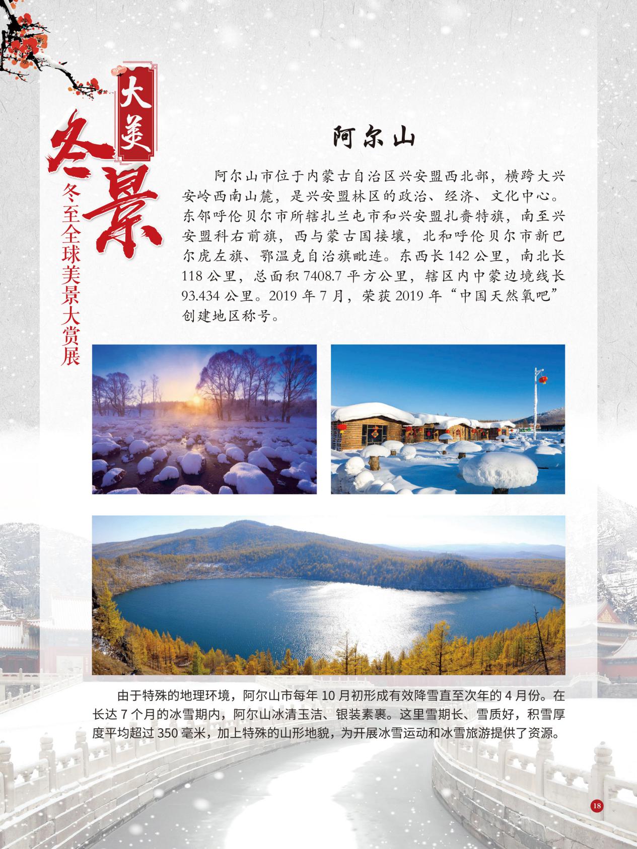 冬至是中国民间的传统节日,于每年公历12月21日至23日交节。冬至是四时八节之一,被视为冬季的大节日,在古代民间有“冬至大如年”的讲法,所以古人称冬至为“亚岁”或“小年”。冬至兼具自然与人文两大内涵,是二十四节气中一个重要的节气。 冰雪,是冬天谱写的一曲曲华丽乐章,是毛主席笔下的“北国风光,千里冰封,万里雪飘” ,是杜甫笔下的“窗含西岭千秋雪,门泊东吴万里船”, 是岑参笔下的“忽如一夜春风来,千树万树梨花开”,是柳宗元笔下的“孤舟蓑笠翁,独钓寒江雪”……地域不一样,冬天谱写的冰雪乐章也不一样,即便是同一处冰雪胜景,不同的人品出的也是不一样的味。冬天的美景是大自然的馈赠,本展览主要介绍冬至来临之后全球的冰雪美景奇观,带大家一起领略冬季的风采,探寻大自然的奥秘!